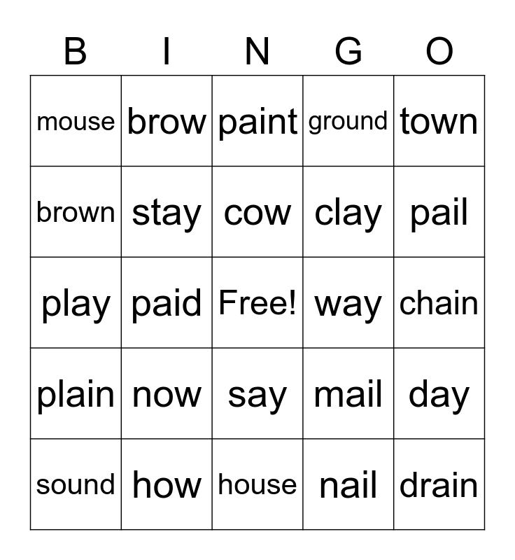 This bingo card has a free space and 24 words: now, how, cow, sound, town, mouse, brown, brow, way, say, clay, play, mail, day, stay, nail, chain, paint, pail, paid, drain, plain, ground and house.