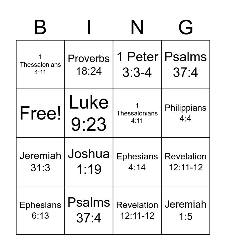 This bingo card has 16 words: Psalms 37:4, Revelation 12:11-12, 1 Peter 3:3-4, 1 Thessalonians 4:11, Jeremiah 31:3, Proverbs 18:24, Ephesians 4:14, Revelation 12:11-12, Free!, Luke 9:23, Ephesians 6:13, Psalms 37:4, Joshua 1:19, Philippians 4:4, 1 Thessalonians 4:11 and Jeremiah 1:5.