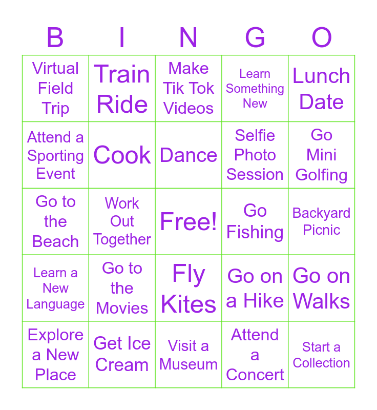 This bingo card has a free space and 38 words: Listen to Music, Play Cards, Play Board Games, Cook, Go on Walks, Go to the Movies, Dance, Bike Ride, Lunch Date, Selfie Photo Session, Work Out Together, Learn Something New, Start a Collection, Backyard Picnic, Attend a Sporting Event, Learn a New Language, Read Books, Make Tik Tok Videos, Volunteer, Go Fishing, Virtual Field Trip, Get Ice Cream, Go Mini Golfing, Explore a New Place, Pedicures, Visit a Museum, Eat Breakfast, Go Shopping, Watch the Sunset, Watch the Sunrise, Build a Fort, Fly Kites, Attend a Concert, Train Ride, Go Skating, Go on a Hike, Go to the Beach and Go to the Movies.