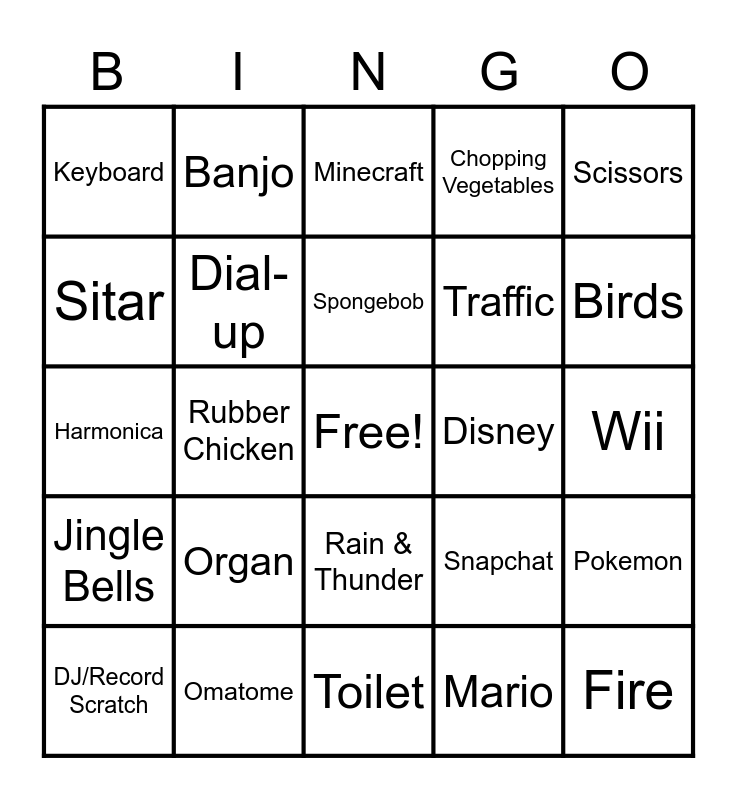 This bingo card has a free space and 55 words: Sprinkler, DJ/Record Scratch, Train, Keyboard, Toilet, Clock Ticking, Dial-up, Microwave, Traffic, Siri, Chopping Vegetables, Choir, Pencil, Coins, Bowling, Cards Shuffling, Scissors, Rubber Chicken, Windchimes, Fire, Disney, Pacman, Snapchat, Minecraft, Pixar, Spongebob, Mario, iPhone, Wii, Pokemon, Cowbell, Accordion, Harp, Saxophone, Sitar, Harmonica, Tuba, Jingle Bells, Didgeridoo, Egg Shaker, Banjo, Bass, Cat, Bagpipes, Organ, Omatome, Theremin, Steel Guitar, Marimba, Birds, Cicada, Eagle, Beach, Rain & Thunder and Stream.