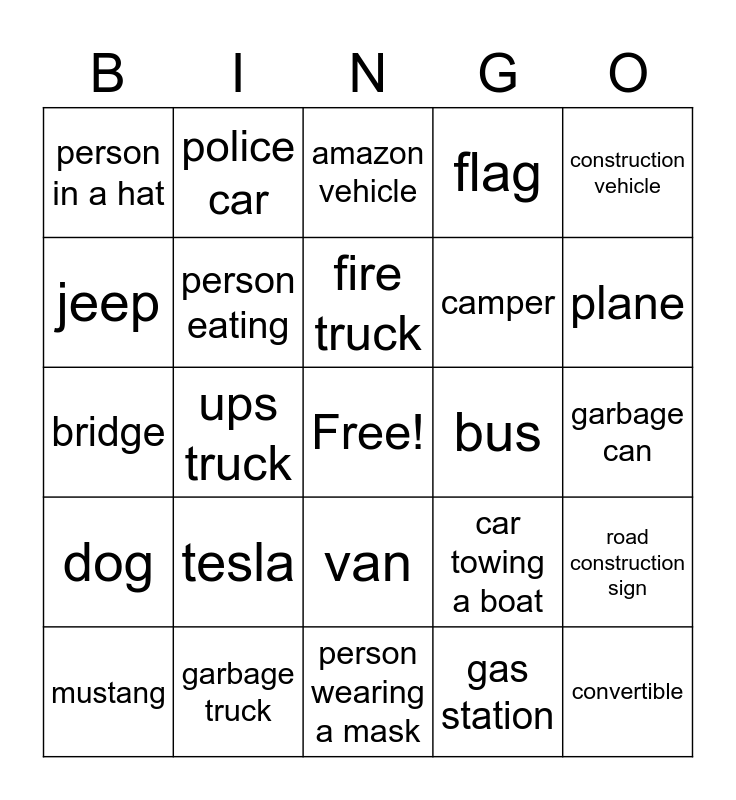 This bingo card has a free space and 24 words: tesla, garbage truck, fire truck, mustang, construction vehicle, person in a hat, jeep, police car, bus, van, camper, bridge, car towing a boat, road construction sign, person eating, gas station, garbage can, amazon vehicle, plane, ups truck, convertible, dog, flag and person wearing a mask.