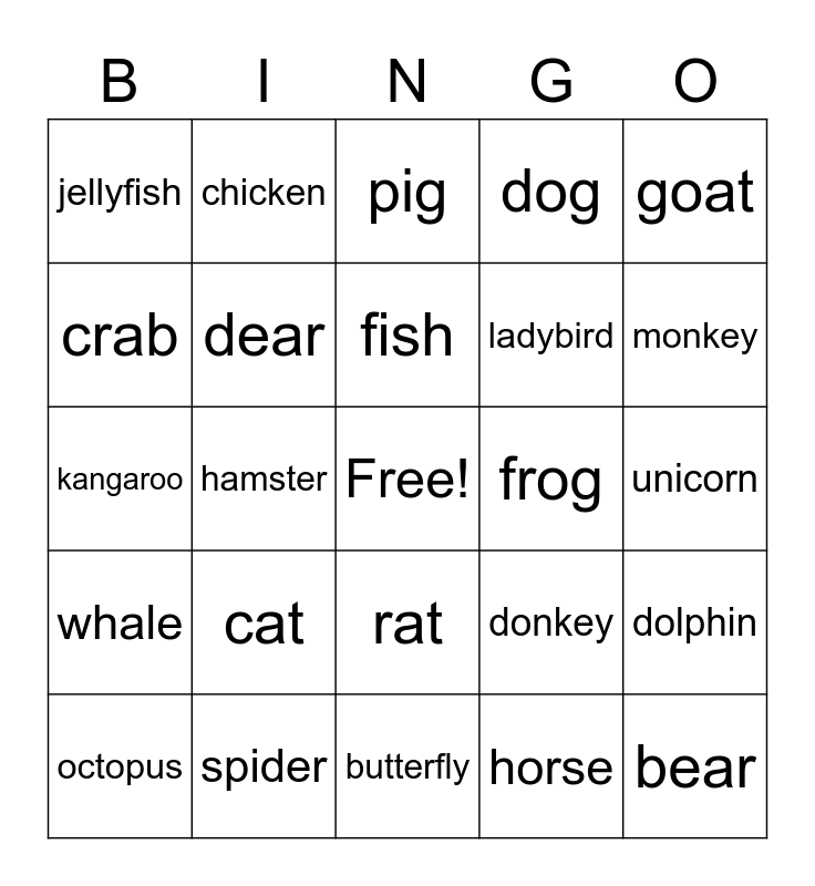This bingo card has a free space and 51 words: ant, bear, bee, butterfly, cat, camel, chicken, cow, crab, crocodile, dear, dog, dolphin, donkey, duck, elephant, fish, frog, giraffe, goat, hamster, horse, jellyfish, ladybird, sheep, lion, monkey, mouse, octopus, pig, panda, pony, rabbit, seahorse, snake, spider, starfish, tiger, turkey, turtle, unicorn, whale, worm, zebra, dinosaur, dragon, kangaroo, clownfish, hippo, rat and ostrich.