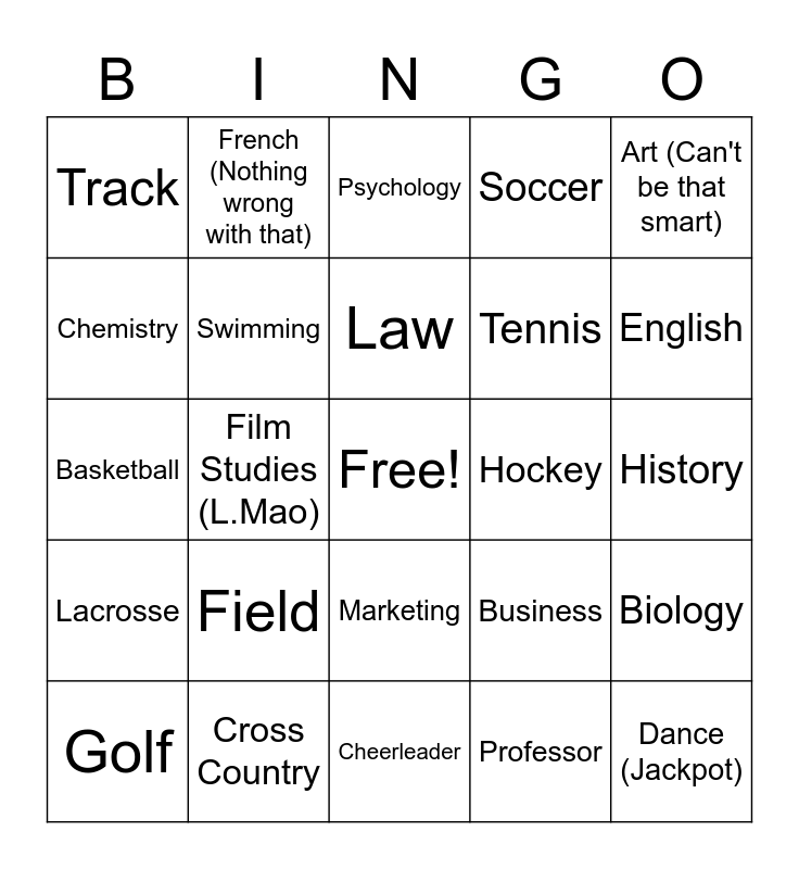 This bingo card has a free space and 25 words: Field, Cheerleader, Law, Golf, Art (Can't be that smart), Track, Chemistry, French (Nothing wrong with that), Hockey, Marketing, Tennis, Basketball, Business, Biology, Swimming, Economics, History, Psychology, English, Film Studies (L.Mao), Dance (Jackpot), Cross Country, Lacrosse, Soccer and Professor.