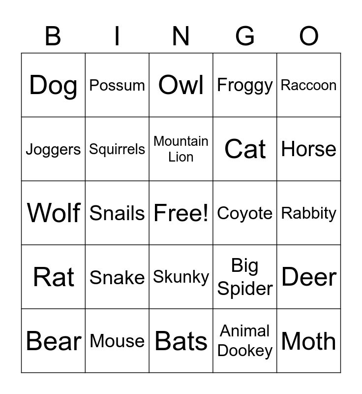 This bingo card has a free space and 25 words: Snake, Bats, Mountain Lion, Bear, Raccoon, Dog, Joggers, Possum, Coyote, Skunky, Cat, Wolf, Big Spider, Deer, Squirrels, Chipmunk, Rabbity, Owl, Horse, Snails, Moth, Mouse, Rat, Froggy and Animal Dookey.