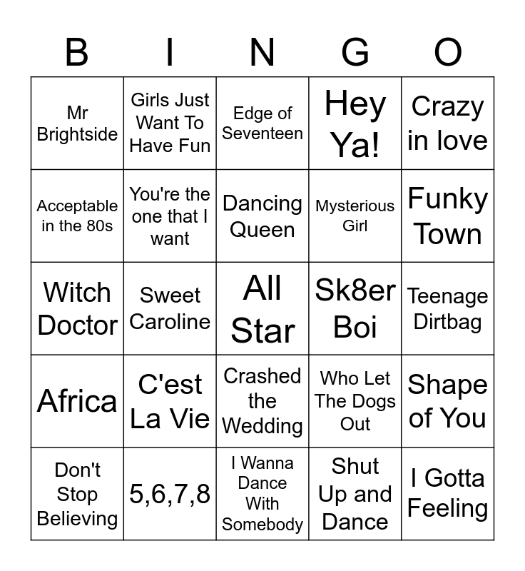 This bingo card has 41 words: Free!, Witch Doctor, Spice up your life, You're the one that I want, 5,6,7,8, Crashed the Wedding, Dancing Queen, Barbie Girl, Crazy in love, Africa, Sweet Caroline, Hey Ya!, All Star, Teenage Dirtbag, Sk8er Boi, C'est La Vie, MMMBop, Mr Brightside, Happy, Edge of Seventeen, Shape of You, I Gotta Feeling, I Wanna Dance With Somebody, Mysterious Girl, Millkshake, Eye of the Tiger, Shut Up and Dance, White Wedding, Funky Town, U Can't Touch This, It's Raining Men, Girls Just Want To Have Fun, Don't Stop Believing, …Baby One More Time, Who Let The Dogs Out, Acceptable in the 80s, We are family, Livin' la Vida Loca, Waterloo, Bonkers and Bohemian Rhopsody.