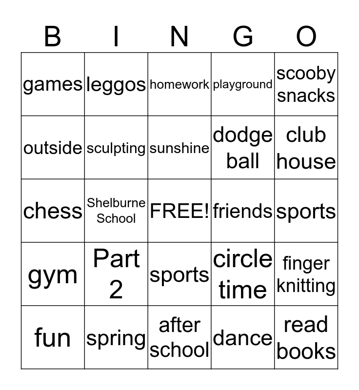 This bingo card has a free space and 24 words: Part 2, spring, sunshine, fun, scooby snacks, games, outside, leggos, friends, sports, dodge ball, chess, circle time, finger knitting, sculpting, dance, sports, homework, club house, Shelburne School, read books, gym, playground and after school.