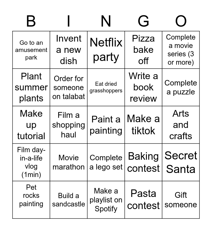 This bingo card has a free space and 24 words: Pet rocks painting, Movie marathon, Eat dried grasshoppers, Pasta contest, Complete a movie series (3 or more), Go to an amusement park, Invent a new dish, Netflix party, Make a tiktok, Arts and crafts, Make up tutorial, Order for someone on talabat, Baking contest, Secret Santa, Plant summer plants, Build a sandcastle, Make a playlist on Spotify, Pizza bake off, Complete a puzzle, Film day-in-a-life vlog (1min), Film a shopping haul, Complete a lego set, Write a book review and Gift someone.