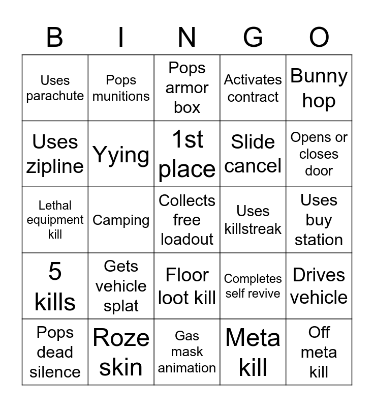 This bingo card has 25 words: Gets vehicle splat, Gas mask animation, 1st place, Pops dead silence, Bunny hop, Uses parachute, Uses zipline, Pops munitions, Uses killstreak, Floor loot kill, Slide cancel, Lethal equipment kill, Completes self revive, Drives vehicle, Yying, Off meta kill, Uses buy station, Pops armor box, Opens or closes door, Camping, Collects free loadout, Roze skin, 5 kills, Activates contract and Meta kill.