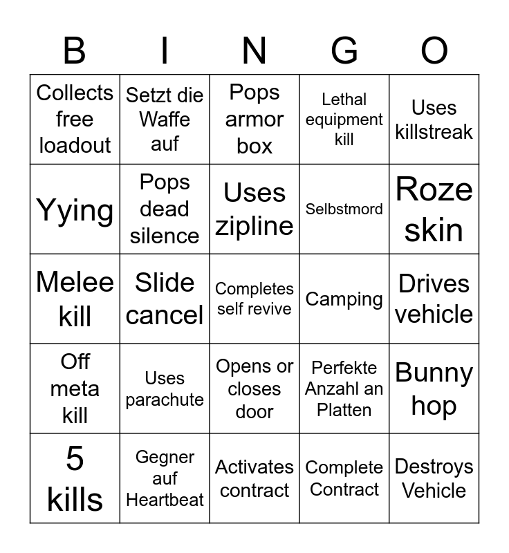 This bingo card has 37 words: Gets vehicle splat, Gas mask animation, 1st place, Pops dead silence, Bunny hop, Uses parachute, Uses zipline, Pops munitions, Uses killstreak, Floor loot kill, Slide cancel, Lethal equipment kill, Completes self revive, Drives vehicle, Yying, Off meta kill, Uses buy station, Pops armor box, Opens or closes door, Camping, Collects free loadout, Roze skin, 5 kills, Activates contract, Meta kill, Complete Contract, Setzt die Waffe auf, Dropshots, Hinlegen, Hipfire kill, Sniper glare, Gegner auf Heartbeat, Melee kill, Destroys Vehicle, Perfekte Anzahl an Platten, Selbstmord and 1Shot 1Kill.