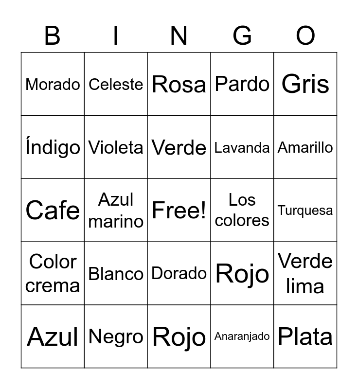 This bingo card has a free space and 24 words: Azul, Blanco, Verde, Anaranjado, Gris, Morado, Celeste, Rosa, Los colores, Turquesa, Cafe, Violeta, Rojo, Verde lima, Índigo, Negro, Rojo, Pardo, Amarillo, Color crema, Azul marino, Dorado, Lavanda and Plata.