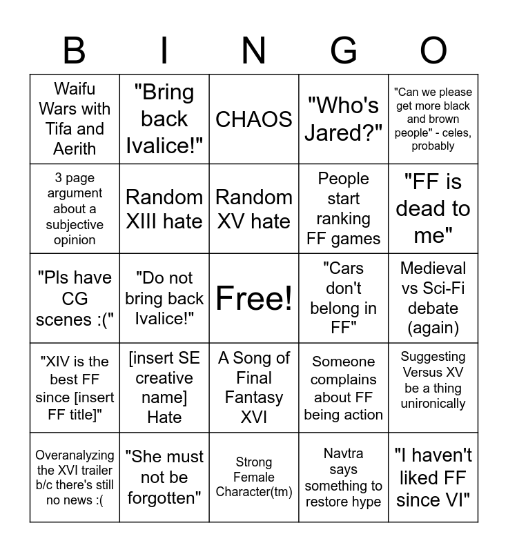 This bingo card has a free space and 24 words: [insert SE creative name] Hate, "She must not be forgotten", Random XV hate, Overanalyzing the XVI trailer b/c there's still no news :(, "Can we please get more black and brown people" - celes, probably, Waifu Wars with Tifa and Aerith, 3 page argument about a subjective opinion, "Bring back Ivalice!", "Cars don't belong in FF", A Song of Final Fantasy XVI, People start ranking FF games, "Pls have CG scenes :(", Someone complains about FF being action, Suggesting Versus XV be a thing unironically, Random XIII hate, Navtra says something to restore hype, Medieval vs Sci-Fi debate (again), CHAOS, "FF is dead to me", "Do not bring back Ivalice!", "I haven't liked FF since VI", "XIV is the best FF since [insert FF title]", "Who's Jared?" and Strong Female Character(tm).