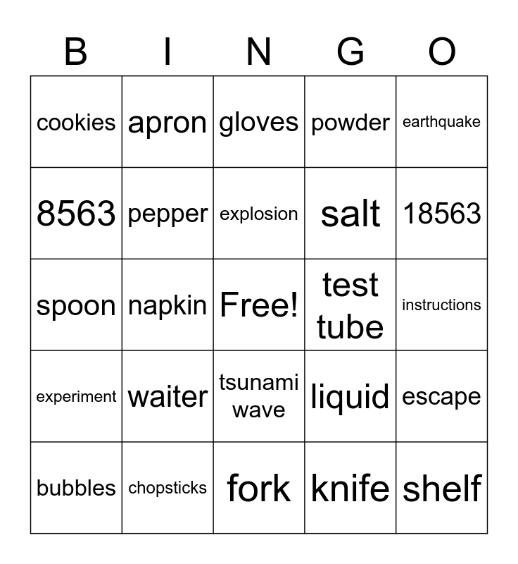 This bingo card has a free space and 24 words: waiter, chopsticks, explosion, bubbles, earthquake, cookies, 8563, apron, test tube, tsunami wave, salt, spoon, liquid, escape, pepper, knife, instructions, gloves, 18563, napkin, shelf, experiment, powder and fork.