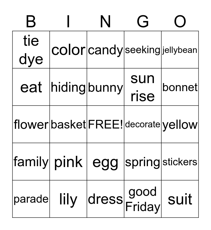 This bingo card has a free space and 33 words: chocolate, daffodil, basket, symbol, family, hiding, jellybean, parade, color, cookout, bunny, candy, grass, holiday, decorate, bonnet, lily, flower, pink, spring, egg, dye, tie dye, yellow, dress, suit, seeking, sun rise, eat, stickers, wreath, good Friday and purple.