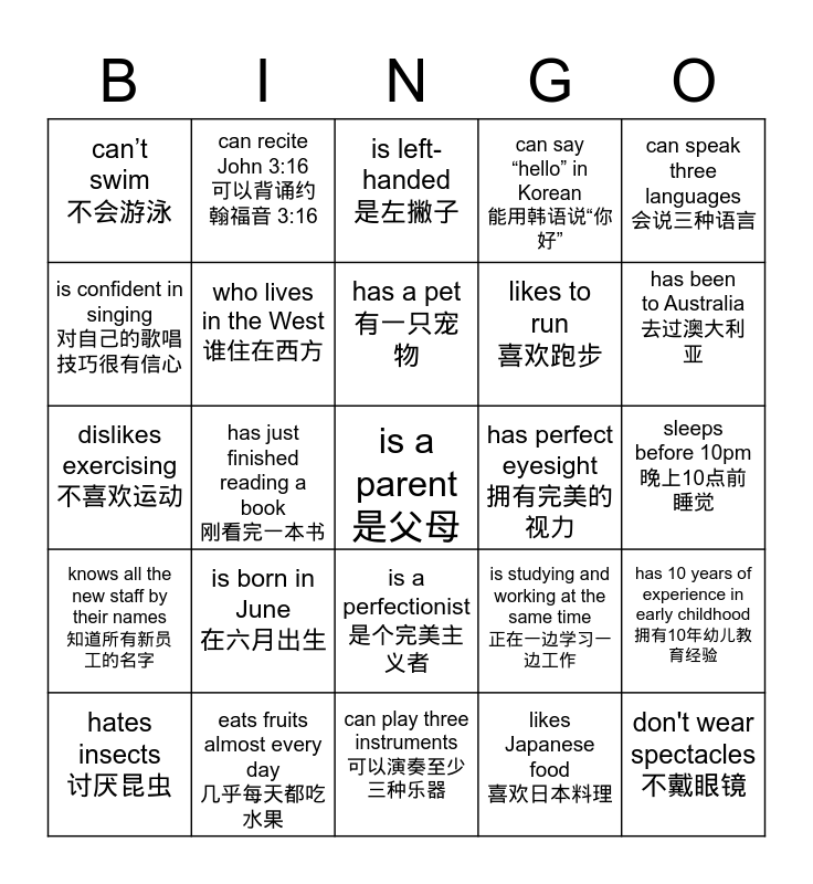 This bingo card has 25 words: is born in June 在六月出生, can play three instruments 可以演奏至少三种乐器, has a pet 有一只宠物, hates insects 讨厌昆虫, can speak three languages 会说三种语言, can’t swim 不会游泳, is confident in singing 对自己的歌唱技巧很有信心, can recite John 3:16 可以背诵约翰福音 3:16, has perfect eyesight 拥有完美的视力, is a perfectionist 是个完美主义者, likes to run 喜欢跑步, dislikes exercising 不喜欢运动, is studying and working at the same time 正在一边学习一边工作, has 10 years of experience in early childhood 拥有10年幼儿教育经验, who lives in the West 谁住在西方, don't wear spectacles 不戴眼镜, sleeps before 10pm 晚上10点前睡觉, is left-handed 是左撇子, has been to Australia 去过澳大利亚, has just finished reading a book 刚看完一本书, is a parent 是父母, eats fruits almost every day 几乎每天都吃水果, knows all the new staff by their names 知道所有新员工的名字, can say “hello” in Korean 能用韩语说“你好” and likes Japanese food 喜欢日本料理.