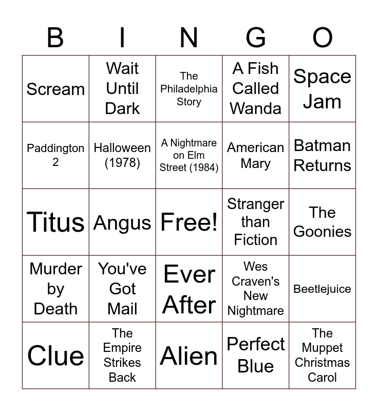 This bingo card has a free space and 24 words: You've Got Mail, The Empire Strikes Back, A Nightmare on Elm Street (1984), Clue, Space Jam, Scream, Paddington 2, Wait Until Dark, Stranger than Fiction, Ever After, American Mary, Titus, Wes Craven's New Nightmare, Beetlejuice, Halloween (1978), Perfect Blue, The Goonies, The Philadelphia Story, Batman Returns, Angus, The Muppet Christmas Carol, Murder by Death, A Fish Called Wanda and Alien.