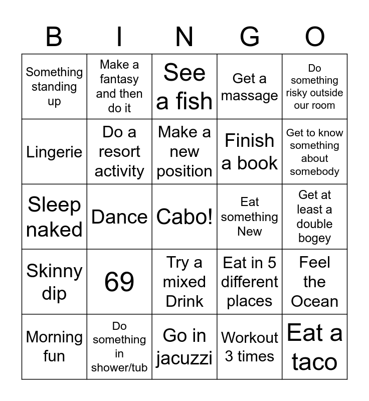 This bingo card has a free space and 24 words: 69, Do something in shower/tub, Make a new position, Morning fun, Do something risky outside our room, Something standing up, Lingerie, Make a fantasy and then do it, Eat something New, Try a mixed Drink, Finish a book, Sleep naked, Eat in 5 different places, Feel the Ocean, Do a resort activity, Workout 3 times, Get at least a double bogey, See a fish, Get to know something about somebody, Dance, Eat a taco, Skinny dip, Get a massage and Go in jacuzzi.