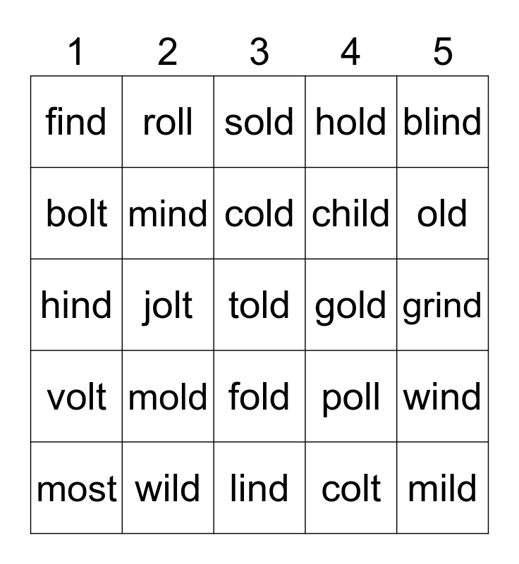 This bingo card has a free space and 24 words: mold, wild, cold, most, blind, find, bolt, roll, gold, fold, child, hind, poll, wind, mind, colt, grind, sold, old, jolt, mild, volt, hold and lind.