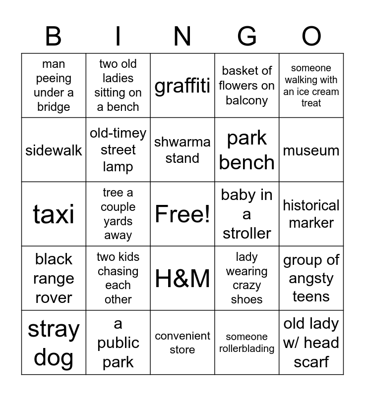 This bingo card has a free space and 29 words: stray dog, crumbling balcony, tree a couple yards away, shopping mall, man peeing under a bridge, graffiti, old-timey street lamp, two kids chasing each other, baby in a stroller, a public park, historical marker, old lady w/ head scarf, convenient store, someone rollerblading, museum, theatre, H&M, black range rover, someone walking with an ice cream treat, taxi, lady wearing crazy shoes, public art, park bench, sidewalk, basket of flowers on balcony, two old ladies sitting on a bench, group of angsty teens, shwarma stand and irish pub.
