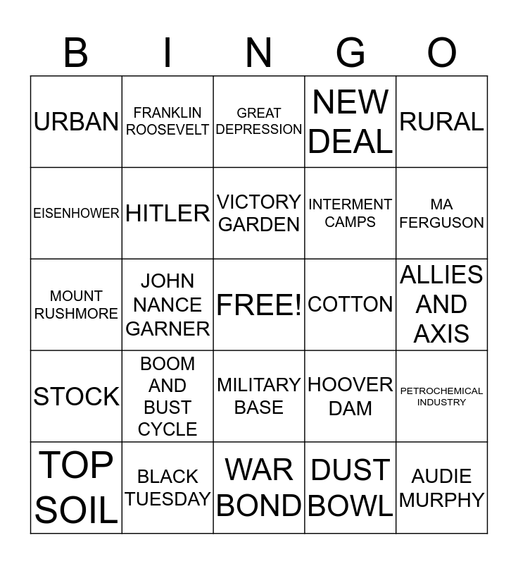This bingo card has a free space and 25 words: BOOM AND BUST CYCLE, WAR BOND, VICTORY GARDEN, TOP SOIL, RURAL, URBAN, EISENHOWER, FRANKLIN ROOSEVELT, COTTON, MILITARY BASE, INTERMENT CAMPS, MOUNT RUSHMORE, HOOVER DAM, PETROCHEMICAL INDUSTRY, HITLER, PEARL HARBOR, ALLIES AND AXIS, GREAT DEPRESSION, MA FERGUSON, JOHN NANCE GARNER, AUDIE MURPHY, BLACK TUESDAY, STOCK, NEW DEAL and DUST BOWL.