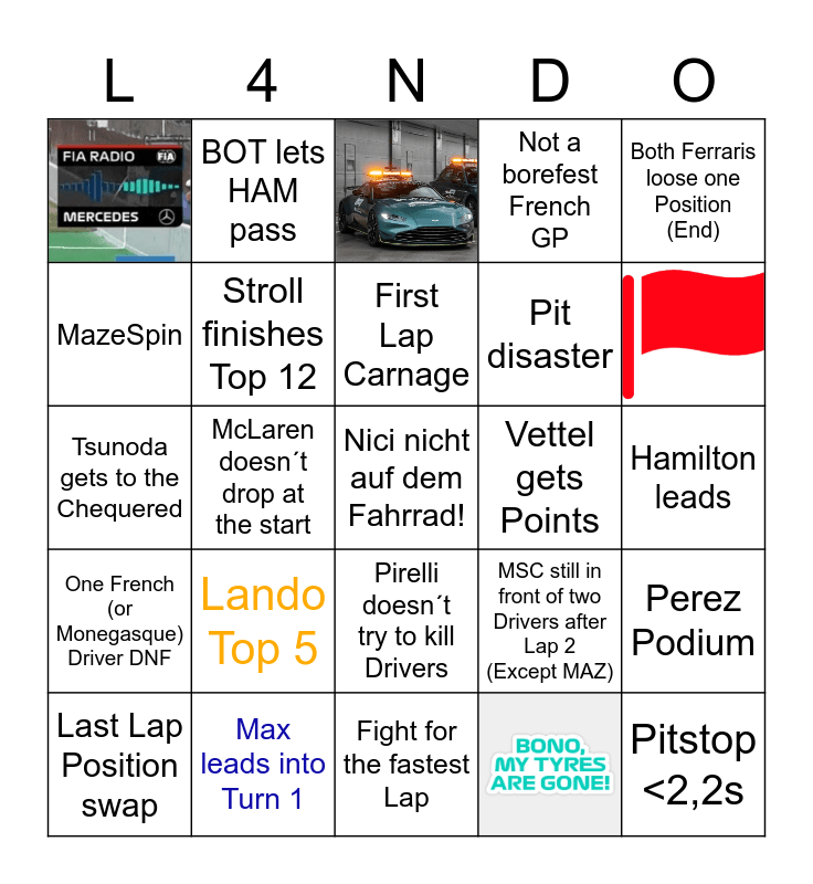 This bingo card has 4 images, a free space and 20 words: Lando Top 5, Max leads into Turn 1, First Lap Carnage, Last Lap Position swap, Both Ferraris loose one Position (End), MazeSpin, BOT lets HAM pass, Vettel gets Points, Pirelli doesn´t try to kill Drivers, Pit disaster, Tsunoda gets to the Chequered, MSC still in front of two Drivers after Lap 2 (Except MAZ), Perez Podium, Stroll finishes Top 12, Hamilton leads, McLaren doesn´t drop at the start, Pitstop <2,2s, One French (or Monegasque) Driver DNF, Not a borefest French GP and Fight for the fastest Lap.