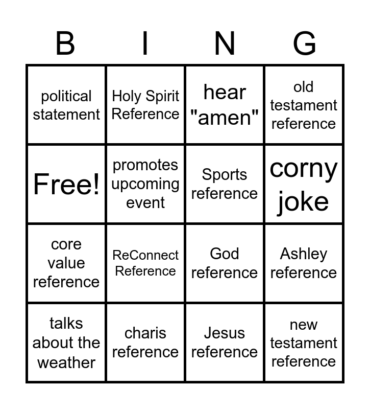 This bingo card has 16 words: charis reference, Ashley reference, hear "amen", political statement, core value reference, Holy Spirit Reference, God reference, Jesus reference, Free!, promotes upcoming event, talks about the weather, old testament reference, ReConnect Reference, corny joke, Sports reference and new testament reference.