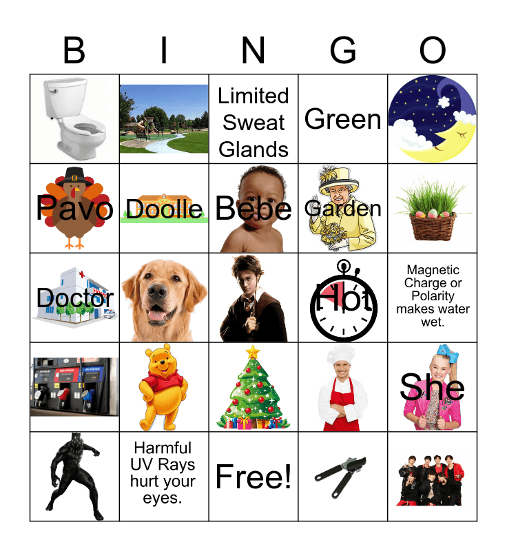 This bingo card has 22 images and 10 words: Limited Sweat Glands, Hot, She, Pavo, Doolle, Free!, Bebe, Garden, Doctor and Green.