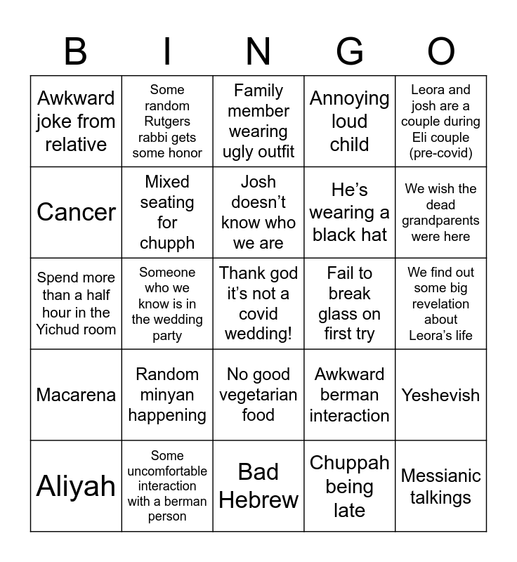This bingo card has a free space and 24 words: Random minyan happening, Some uncomfortable interaction with a berman person, Josh doesn’t know who we are, Aliyah, Leora and josh are a couple during Eli couple (pre-covid), Awkward joke from relative, Cancer, Some random Rutgers rabbi gets some honor, Fail to break glass on first try, No good vegetarian food, He’s wearing a black hat, Spend more than a half hour in the Yichud room, Awkward berman interaction, Yeshevish, Mixed seating for chupph, Chuppah being late, We find out some big revelation about Leora’s life, Family member wearing ugly outfit, We wish the dead grandparents were here, Someone who we know is in the wedding party, Messianic talkings, Macarena, Annoying loud child and Bad Hebrew.