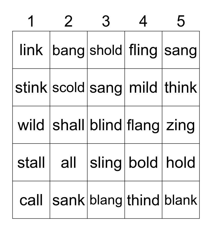 This bingo card has a free space and 24 words: all, sank, sang, call, sang, link, stink, bang, flang, sling, mild, wild, bold, hold, scold, thind, zing, shold, think, shall, blank, stall, fling and blang.