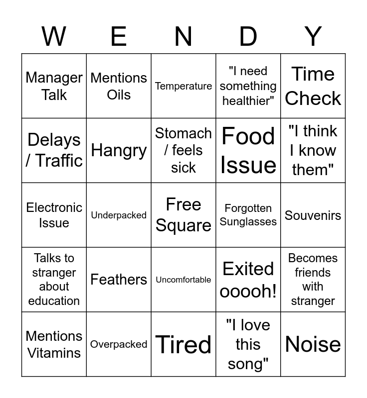 This bingo card has a free space and 24 words: Feathers, Overpacked, Stomach / feels sick, Mentions Vitamins, Time Check, Manager Talk, Delays / Traffic, Mentions Oils, Forgotten Sunglasses, Uncomfortable, Food Issue, Electronic Issue, Exited ooooh!, Becomes friends with stranger, Hangry, "I love this song", Souvenirs, Temperature, "I think I know them", Underpacked, Noise, Talks to stranger about education, "I need something healthier" and Tired.