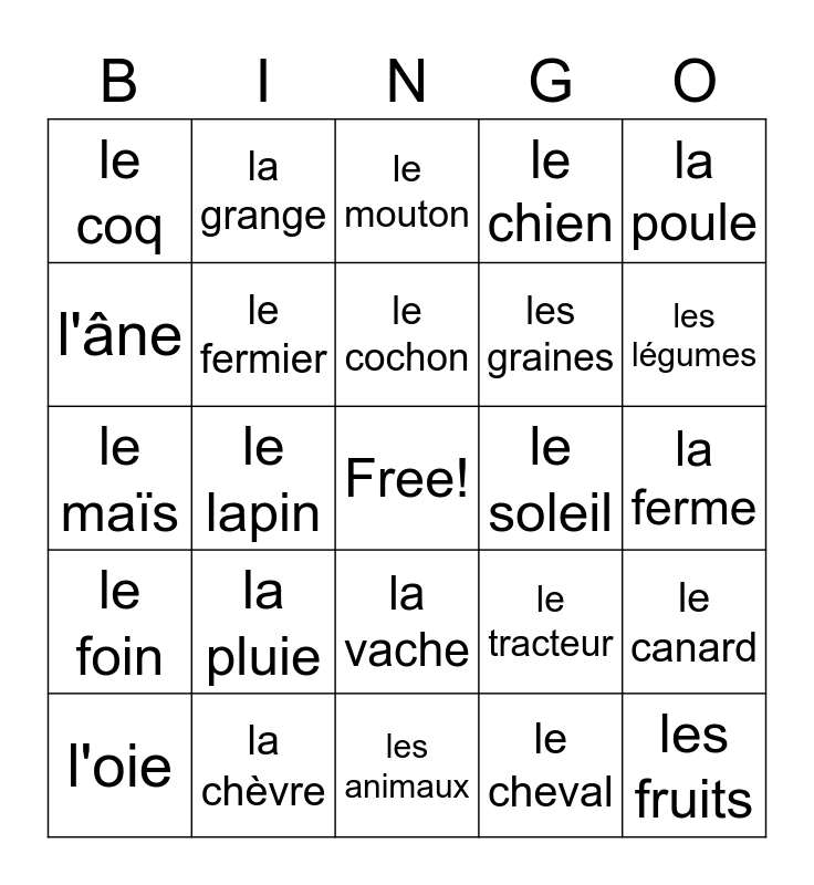 This bingo card has a free space and 26 words: la vache, le cheval, le cochon, la chèvre, la poule, le coq, l'âne, la grange, la ferme, le tracteur, les graines, le maïs, le canard, l'oie, le lapin, le chat, le chien, le foin, le mouton, les fruits, les légumes, les animaux, le soleil, la pluie, le fermier and la fermière.