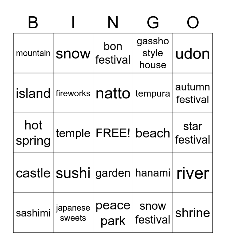 This bingo card has a free space and 24 words: sushi, japanese sweets, natto, sashimi, udon, mountain, island, snow, beach, garden, tempura, hot spring, hanami, river, fireworks, snow festival, star festival, bon festival, autumn festival, temple, shrine, castle, gassho style house and peace park.
