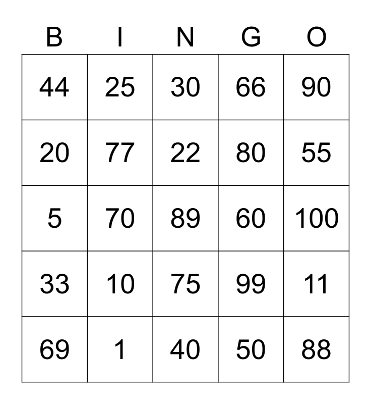 This bingo card has a free space and 24 words: 10, 1, 22, 69, 90, 44, 20, 25, 60, 75, 80, 5, 99, 11, 77, 50, 100, 30, 55, 70, 88, 33, 66 and 40.