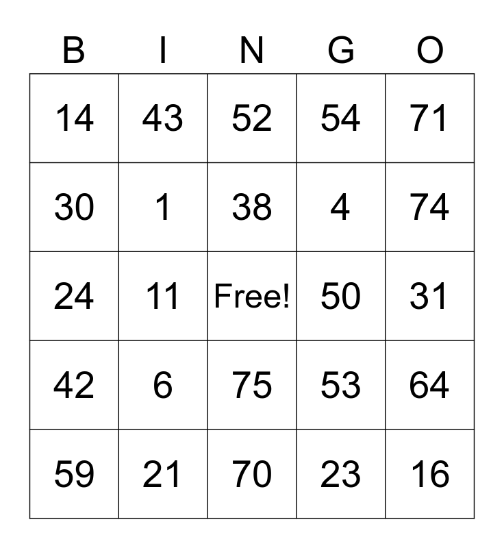 This bingo card has a free space and 24 words: 6, 21, 38, 59, 71, 14, 30, 43, 50, 75, 4, 24, 53, 64, 1, 23, 31, 52, 74, 11, 16, 42, 54 and 70.