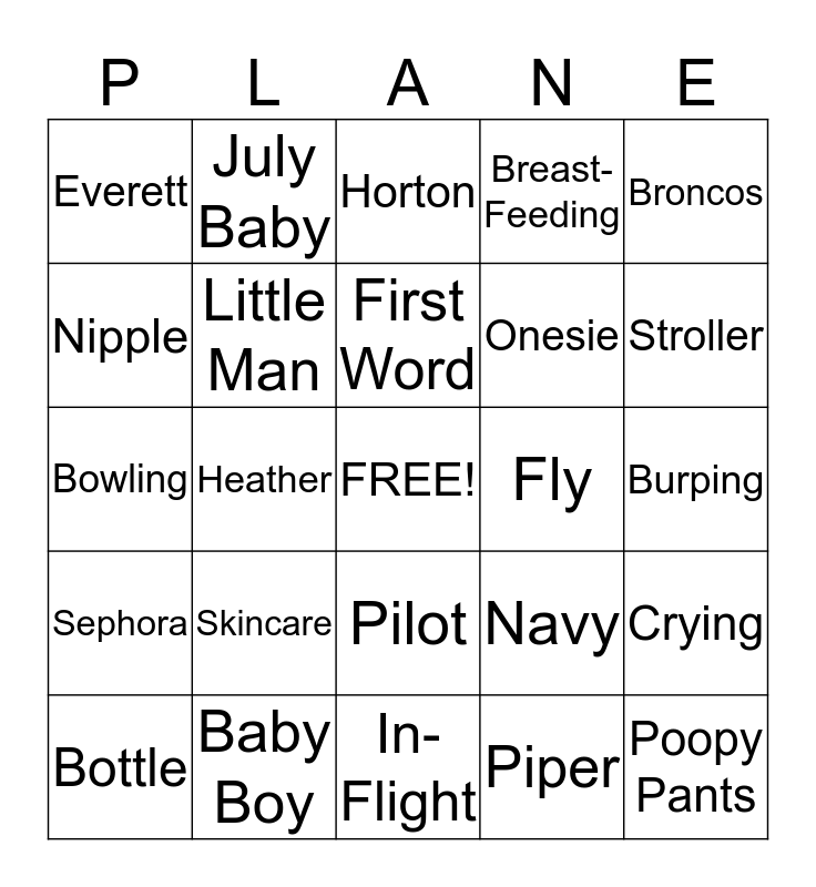 This bingo card has a free space and 30 words: Baby Boy, Diaper, Heather, Chris, Everett, Horton, Little Man, Pilot, Fly, In-Flight, Burping, Poopy Pants, Piper, Corgi, Stroller, Bath Time, Navy, Sephora, Skincare, Broncos, Bowling, Shooting Range, July Baby, Onesie, Nipple, Breast-Feeding, Crying, Bottle, First Word and Chubby Cheeks.