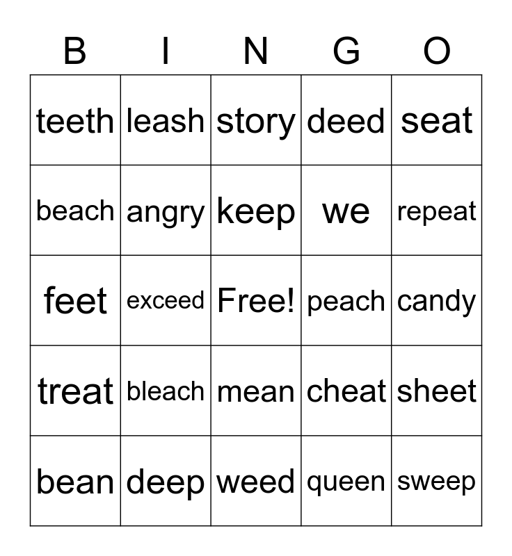 This bingo card has a free space and 24 words: bleach, deep, keep, bean, seat, teeth, beach, leash, peach, mean, we, feet, cheat, sheet, angry, queen, candy, story, repeat, exceed, sweep, treat, deed and weed.
