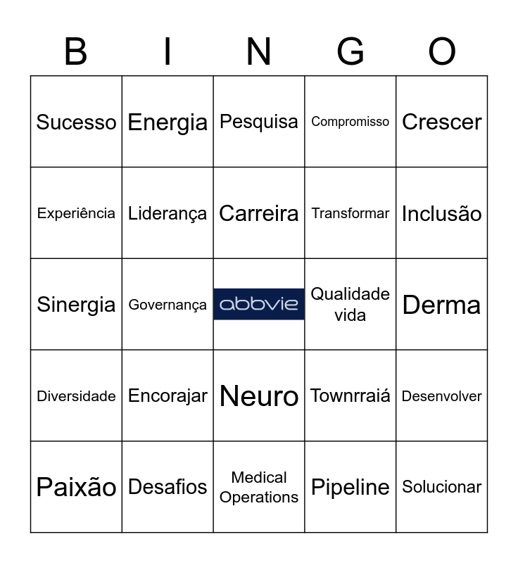 This bingo card has a free space and 59 words: Inspiração, Desafios, Estratégia, Diversidade, Pipeline, Colaborar, Liderança, Impacto notável, Transformar, Oportunidade, Compromisso, Talento, Experiência, Inovação, Pacientes, Sucesso, Solucionar, Crescer, Revolucionar, Carreira, Qualidade vida, Pesquisa, Paixão, Desenvolver, Habilidade, Informação, Compartilhar, Ciência, Inclusão, Propósito, Valor, Possibilidades, Acesso, Conhecimento, Energia, Boas Práticas, Ideias, Governança, 1:1, Sinergia, Confiança, Encorajar, Derma, Reuma, Gastro, Onco, Specialty, Eye Care, Neuro, Medical Operations, Farmaco, Biossimilares, Orgulho, Respeito, 1-7-5, Townrraiá, Engajamento, Agilidade and Feedback.