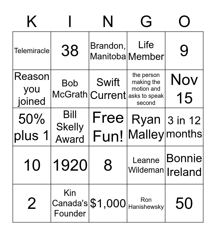 This bingo card has a free space and 24 words: 1920, Kin Canada's Founder, Swift Current, 2, 9, Telemiracle, Reason you joined, 38, Ryan Malley, 8, the person making the motion and asks to speak second, 50% plus 1, Leanne Wildeman, Bonnie Ireland, Bob McGrath, Ron Hanishewsky, 3 in 12 months, Brandon, Manitoba, Nov 15, Bill Skelly Award, 50, 10, Life Member and $1,000.