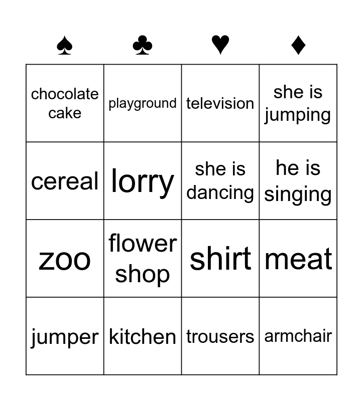 This bingo card has 32 words: goat, crocodile, meat, shower, armchair, she is dancing, cereal, desk, playground, board game, he is singing, television, he is running, bookcase, kitchen, dinosaur, pear, shirt, street, skirt, juice, donkey, trousers, biscuits, jumper, she is jumping, zoo, lorry, chocolate cake, sushi, lizard and flower shop.