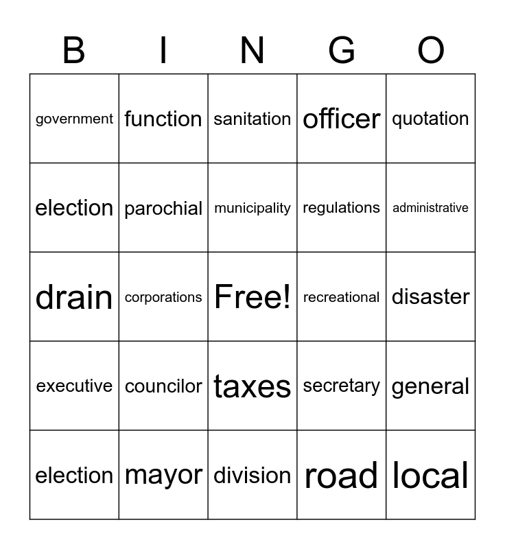 This bingo card has a free space and 24 words: councilor, mayor, municipality, election, quotation, government, election, function, recreational, taxes, regulations, drain, secretary, general, parochial, road, disaster, sanitation, administrative, corporations, local, executive, officer and division.