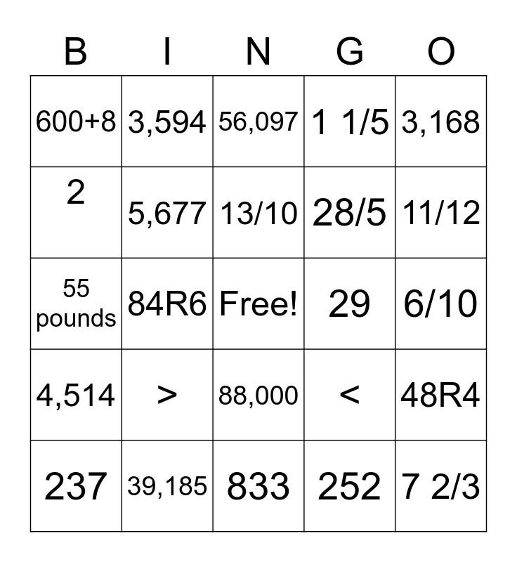 This bingo card has a free space and 24 words: >, 39,185, 13/10, 237, 3,168, 600+8, 2, 3,594, 29, 88,000, 28/5, 55 pounds, <, 48R4, 5,677, 252, 6/10, 56,097, 11/12, 84R6, 7 2/3, 4,514, 1 1/5 and 833.