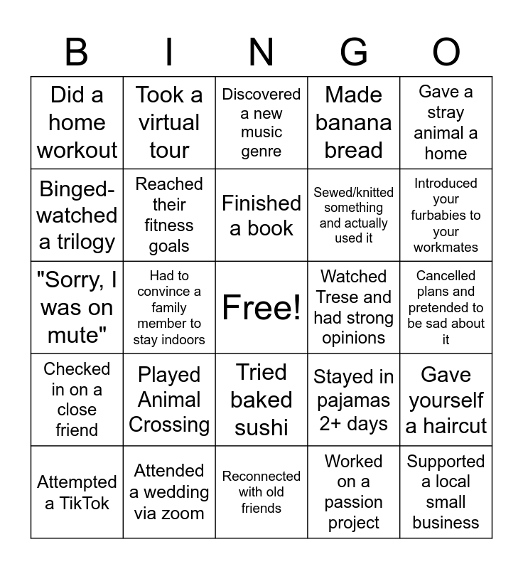This bingo card has a free space and 35 words: Platinum Tier sa Shopee, Paid for an online course, Got vaccinated, Reached their fitness goals, Tried baked sushi, Made banana bread, Binged-watched a trilogy, Worked through lunch, Finished a book, Cancelled vacation plans, "Sorry, I was on mute", Gave a stray animal a home, Googled COVID19 symptoms, Looked for sideline jobs, Did a home workout, Watched Trese and had strong opinions, Worked on a passion project, Had to convince a family member to stay indoors, Checked in on a close friend, Supported a local small business, Stayed in pajamas 2+ days, Attempted a TikTok, Gave yourself a haircut, Attended a wedding via zoom, Discovered a new music genre, Introduced your furbabies to your workmates, Started a home garden, Paid a meal for frontline workers, Sewed/knitted something and actually used it, Cancelled plans and pretended to be sad about it, Tried to learn a new language, Reconnected with old friends, Played Animal Crossing, Took a virtual tour and Questioned your life choices.