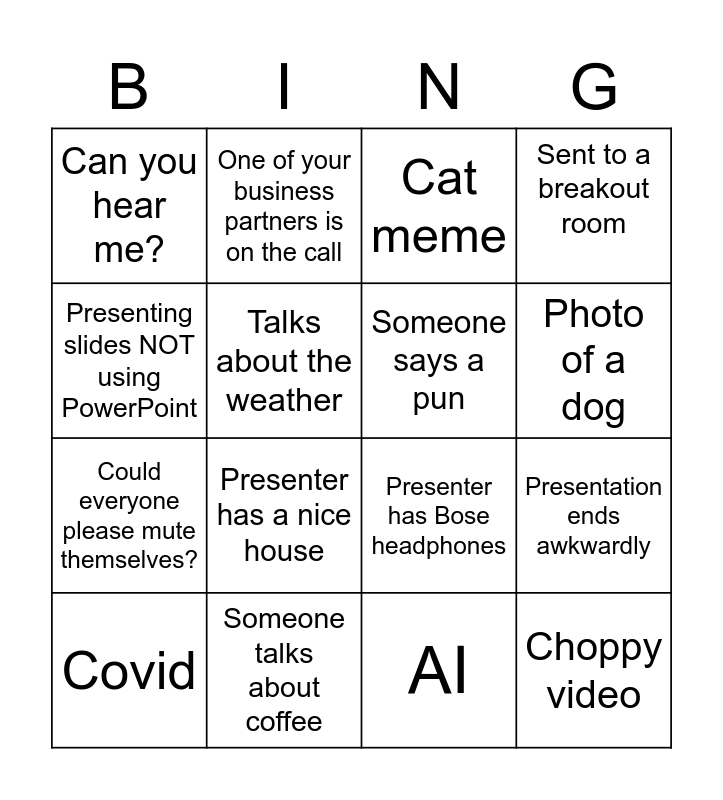 This bingo card has 24 words: Too much text on one slide, 3 people wearing a D3 t-shirt on a call, Photo of a dog, Pre-recorded talking heads saying what they like about D&A Week, Presenting slides NOT using PowerPoint, Can you hear me?, Talks about the weather, One of your business partners is on the call, Someone talks about coffee, NLP, Could everyone please mute themselves?, Presenter has Bose headphones, Child or animal noises, Survey link, Someone says a pun, Uses acronym you don't understand, AI, Cat meme, Presenter has a nice house, Presentation ends awkwardly, Covid, Choppy video, Sent to a breakout room and Customer centric.
