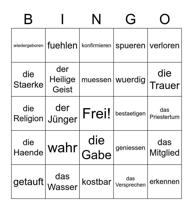 This bingo card has a free space and 29 words: getauft, die Weisung, der Jünger, der Kopf, wiedergeboren, konfirmieren, der Heilige Geist, wahr, bestaetigen, das Wasser, das Priestertum, erkennen, kostbar, das Versprechen, die Trauer, die Pruefung, die Gabe, die Haende, verloren, die Religion, geniessen, fuehren, wuerdig, die Staerke, spueren, fuehlen, das Mitglied, muessen and die Suende.