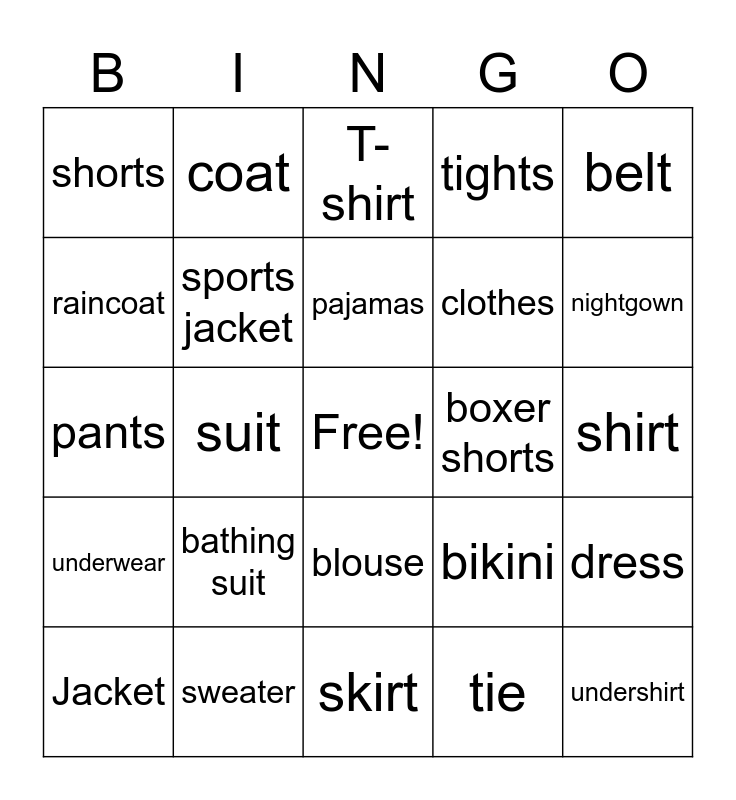 This bingo card has a free space and 24 words: bathing suit, sweater, pajamas, Jacket, belt, shorts, raincoat, coat, boxer shorts, blouse, clothes, pants, bikini, dress, sports jacket, tie, shirt, T-shirt, nightgown, suit, undershirt, underwear, tights and skirt.