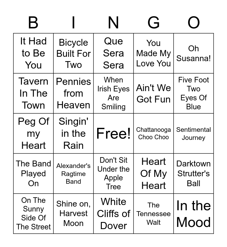 This bingo card has a free space and 30 words: Shine on, Harvest Moon, For Me and My Gal, Singin' in the Rain, Let Me Call You Sweetheart, It Had to Be You, Que Sera Sera, Pennies from Heaven, Don't Sit Under the Apple Tree, Chattanooga Choo Choo, White Cliffs of Dover, Sentimental Journey, In the Mood, The Tennessee Walt, Take Me Out To The Ballgame, Five Foot Two Eyes Of Blue, You Are My Sunshine, Heart Of My Heart, The Band Played On, Alexander's Ragtime Band, Oh Susanna!, Peg Of my Heart, Oh, You Beautiful Doll, Bicycle Built For Two, Ain't We Got Fun, Tavern In The Town, You Made My Love You, Darktown Strutter's Ball, On The Sunny Side Of The Street, When Irish Eyes Are Smiling and Molly Malone.