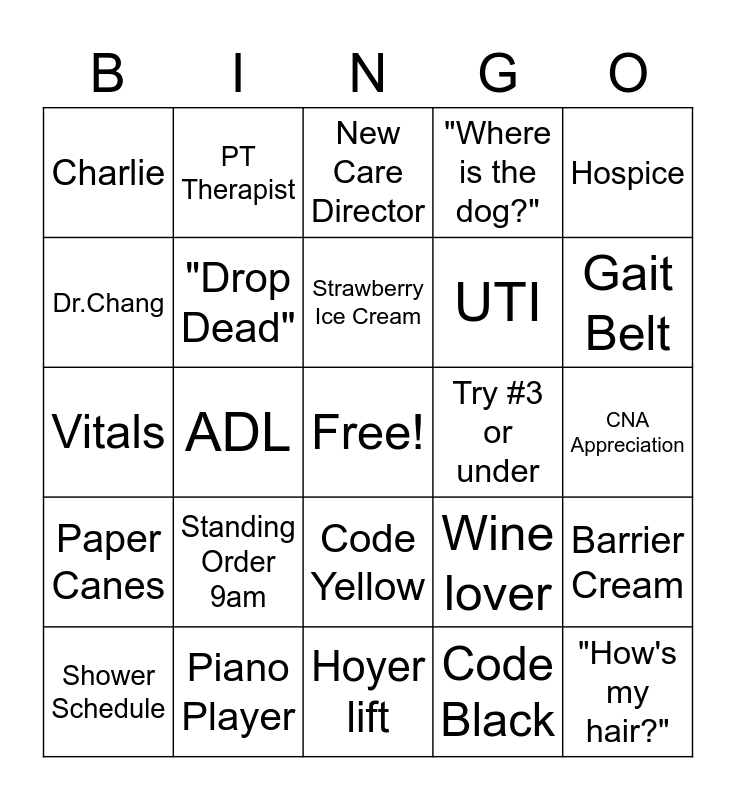 This bingo card has a free space and 34 words: Ted Hose, Code Black, UOR, Sister, Paper Canes, "Drop Dead", Hospice, Shower Schedule, PT Therapist, Cross-over, Strawberry Ice Cream, New Care Director, HH, "Have you seen my purse?", Try #3 or under, Gait Belt, Piano Player, Vitals, Standing Order 9am, Wine lover, Code Yellow, 1:1, Charlie, CNA Appreciation, Hoyer lift, "How's my hair?", "Where is the dog?", PRN, UTI, Dr.Chang, "Bonjour", ADL, Barrier Cream and Copy.