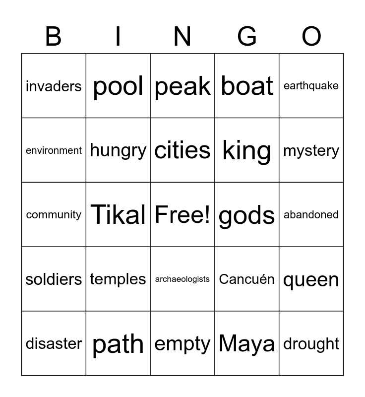This bingo card has a free space and 25 words: temples, empty, cities, disaster, earthquake, invaders, environment, pool, gods, archaeologists, king, community, Cancuén, queen, hungry, scared, abandoned, peak, mystery, Tikal, drought, path, soldiers, boat and Maya.