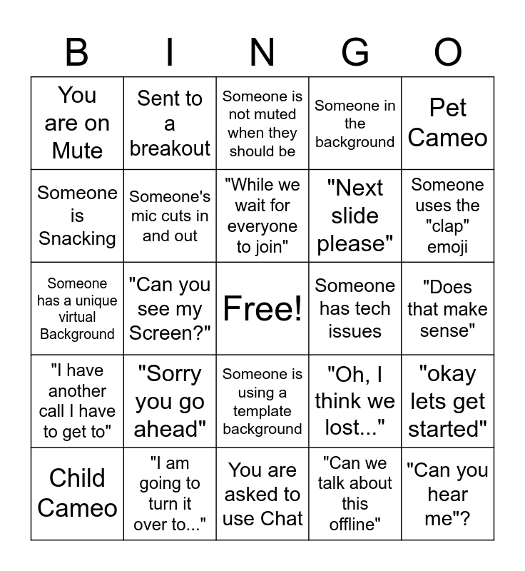 This bingo card has a free space and 24 words: Child Cameo, "Sorry you go ahead", "While we wait for everyone to join", "Can we talk about this offline", Pet Cameo, You are on Mute, Sent to a breakout, Someone is not muted when they should be, Someone has tech issues, "Does that make sense", Someone has a unique virtual Background, Someone's mic cuts in and out, "Oh, I think we lost...", "okay lets get started", Someone is Snacking, "I am going to turn it over to...", You are asked to use Chat, Someone in the background, Someone uses the "clap" emoji, "I have another call I have to get to", "Can you see my Screen?", Someone is using a template background, "Next slide please" and "Can you hear me"?.