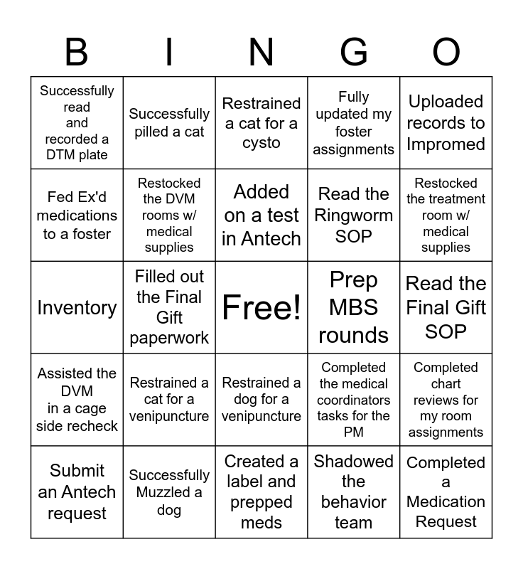 This bingo card has a free space and 24 words: Restrained a cat for a venipuncture, Successfully Muzzled a dog, Added on a test in Antech, Submit an Antech request, Uploaded records to Impromed, Successfully read and recorded a DTM plate, Fed Ex'd medications to a foster, Successfully pilled a cat, Prep MBS rounds, Restrained a dog for a venipuncture, Read the Ringworm SOP, Inventory, Completed the medical coordinators tasks for the PM, Completed chart reviews for my room assignments, Restocked the DVM rooms w/ medical supplies, Shadowed the behavior team, Read the Final Gift SOP, Restrained a cat for a cysto, Restocked the treatment room w/ medical supplies, Filled out the Final Gift paperwork, Completed a Medication Request, Assisted the DVM in a cage side recheck, Fully updated my foster assignments and Created a label and prepped meds.