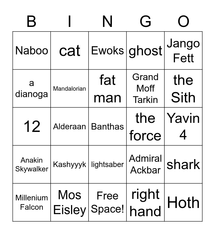 This bingo card has 29 words: Millenium Falcon, George Lucas, Alderaan, Hoth, Naboo, Ewoks, Mandalorian, Kashyyyk, the force, Mos Eisley, Yavin 4, Banthas, Free Space!, right hand, the Sith, Wampa, lightsaber, Anakin Skywalker, Jango Fett, 12, Admiral Ackbar, Padme Amidala, Grand Moff Tarkin, a dianoga, ghost, cat, shark, fat man and shadow.